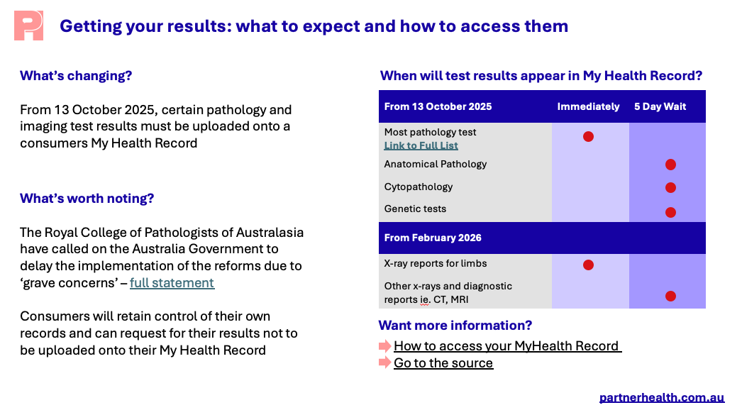 On 13 October 2025, the Australian Digital Health Agency (ADHA) confirmed that the immediate release of pathology results was now live, allowing consumers to view their results directly in their My Health Record profile 👉 More info here